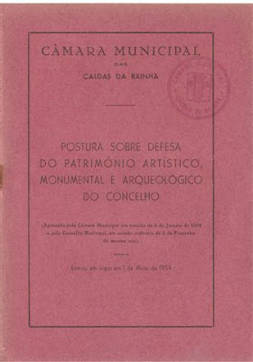 [Postura Sobre Defesa do Património Artístico, Monumental e Arqueológico do Concelho (Aprovado pela Câmara Municipal em reunião de 6 de Janeiro de 1954 e pelo Conselho Municipal, em sessão ordinária de 9 de Fevereiro do mesmo ano). Entrou em vigor em 1 de Maio de 1954. Câmara Municipal das Caldas da Rainha. Minerva Caldense, Caldas da Rainha, 1954. 500 exemplares]